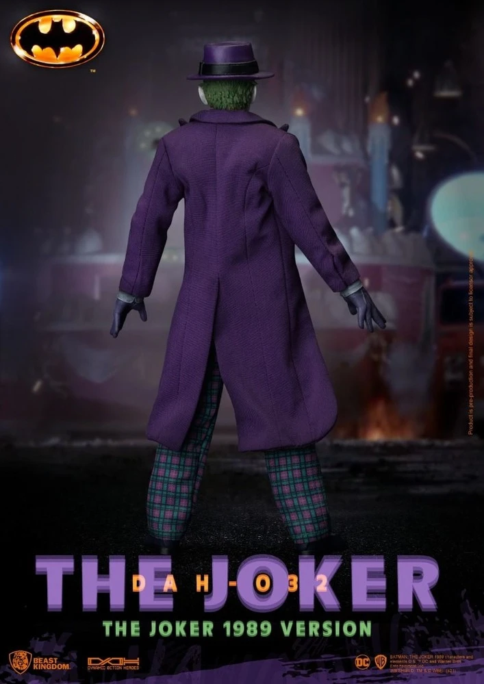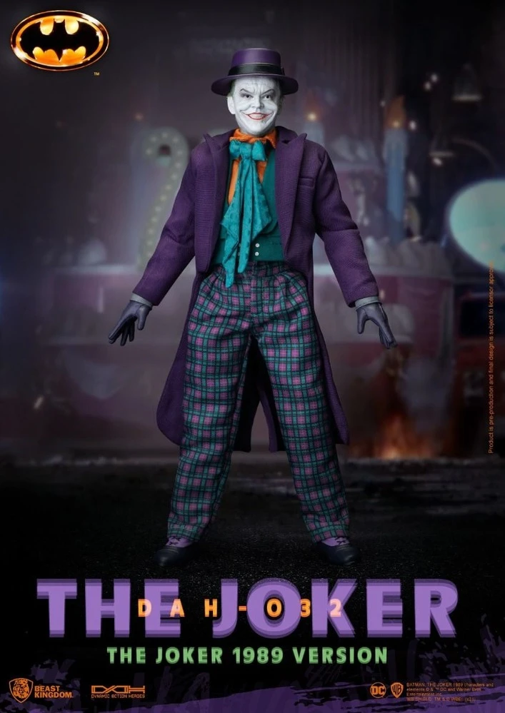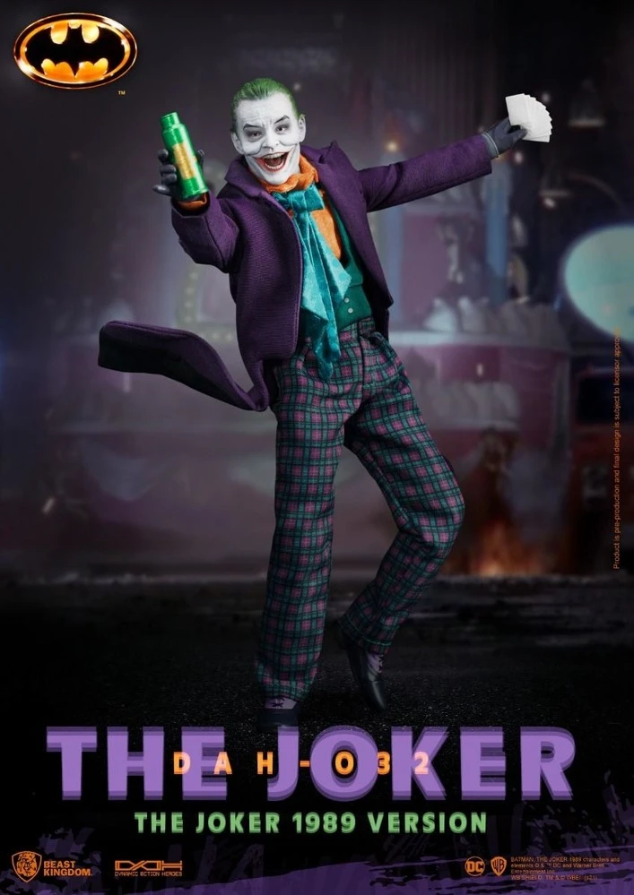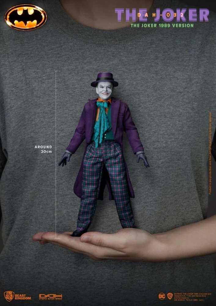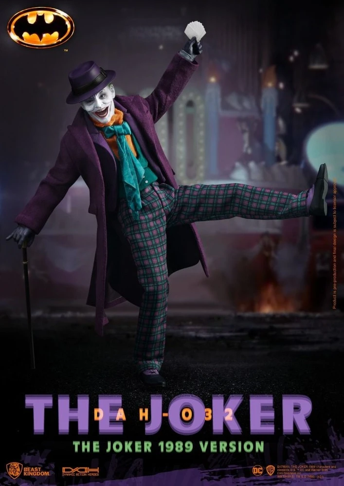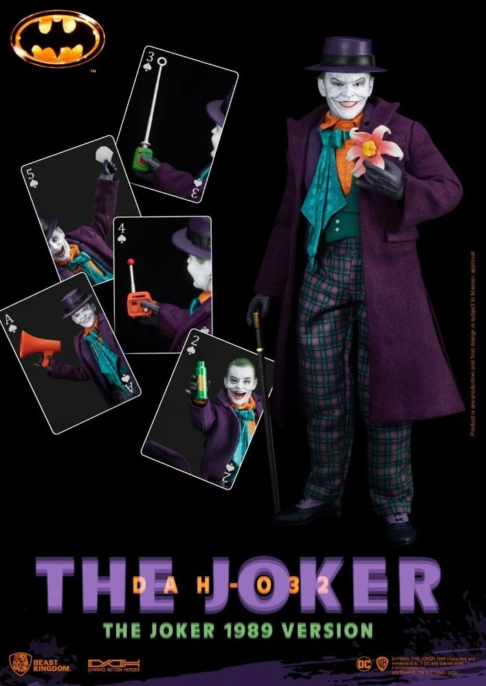 Beast Kingdoms Entertainment Experience Brand proudly enters the world of Tim Burtons Batman with the release of a highly articulable DAH-032 Batman 1989 Joker. An action figure ready for the ultimate in posing possibilities with its 20 points of articulation, the Jokers diverse yet scary grin is on full display, with two replaceable head sculpts. With an attention to detail, every element of the 1989 Joker is recreated using a full body suit made of real fabric as well as a set of seven replaceable hands. Included in the set are also some of the Jokers most iconic accessories, such as the flag pistol, megaphone, dentures and more.