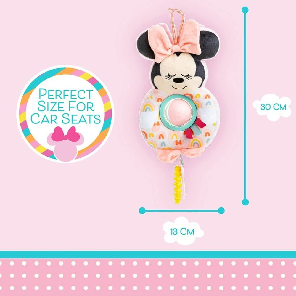 Keep baby happy and soothed with this adorable Minnie Mouse activity toy featuring soft texture, on-the-go velcro strap, spinner ball rattle, ribbons, teether rings, crinkle, and double-sided design. Hang this soft toy from a stroller or crib and watch baby’s eyes light up from all the fun and developmental features! Minnie Mouse is an instantly recognizable friend, bringing sweet memories from childhood as it helps children to learn, play, and grow.