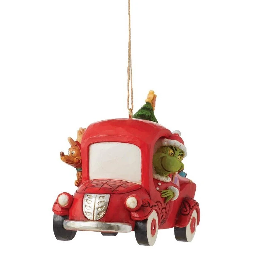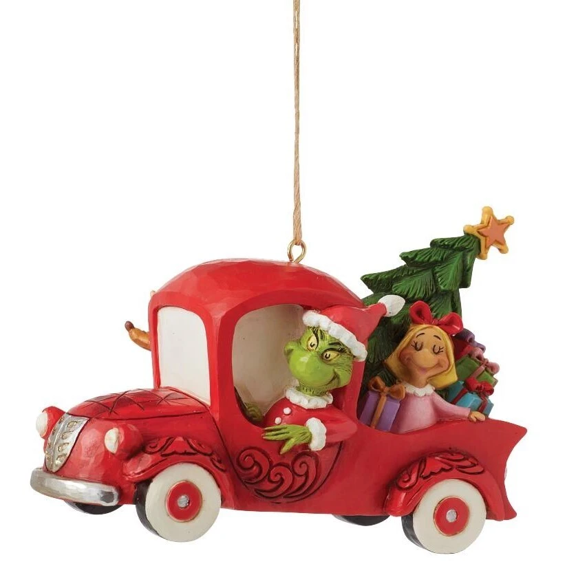 From the branches of your tree this ornament features the Grinch as he steers a Jim Shore rosemaled red pickup truck. With a haul of presents and holiday tree, the Grinch aims to redeliver the Christmas he stole.