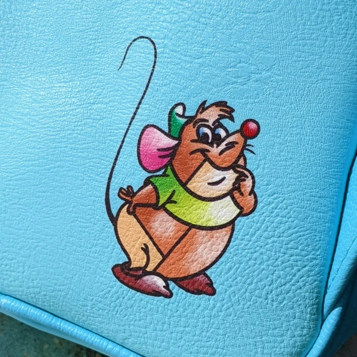 This enchanting backpack by Loungefly shows Cinderella dancing in the Prince’s arms as they gaze lovingly at one another in a stained glass art style, surrounded by a collage of beautiful motifs inspired by the Royal Palace. Above them is a glass slipper; the leftover piece of the Fairy Godmother’s magical spell that brings the two back together after Cinderella’s hasty depature from the ball. Watching on below are Cinderelly’s loyal mouse friends, Jaq and Gus, while betwixt the two is the elegant coach conjured from a pumpkin. The glass slipper is also featured as the bag’s enamel zipper charm, perfectly complimented by stunning blue vegan-friendly leather and matching piping.