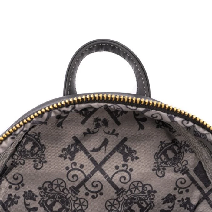 The Loungefly Disney Cinderella Evil Stepmother and Stepsisters Villains Scene Mini Backpack is made of vegan leather (polyurethane). Bag has adjustable shoulder straps, sturdy metal hardware, and features: applique, metallic, and printed details. Take note of the coordinating pattern of the inside lining fabric.