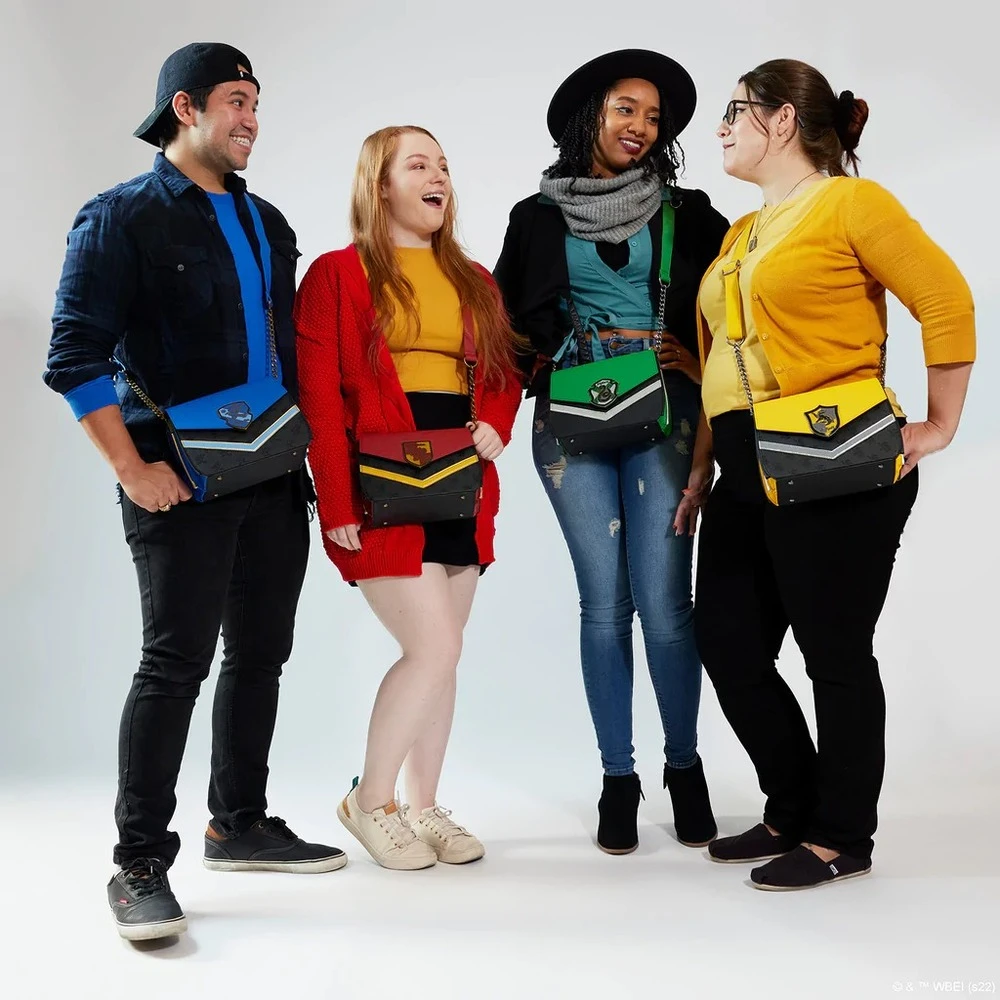 Enter the halls of Hogwarts School of Witchcraft and Wizardry in spellbinding style with this Loungefly Harry Potter Hufflepuff Chain Strap Crossbody Bag. This charming crossbody bag incorporates the yellow and black Hufflepuff House colors in a chevron pattern. The Hufflepuff crest is on a metal rivet, and the badger logo appears again as a debossed all-over-print on top of a black base. The accordion-style sides reveal accents of strands of silver, and a silver chain strap tops off the look. Its the perfect accessory for attending a potions class or Quidditch matchor for turning everyday outings into enchanting moments.