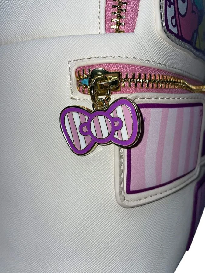 Made to resemble an arcade claw machine, this adorable accessory can not only be worn as a backpack, but is easily convertible with an extra long strap to wear like a crossbody bag! Behind a layer of clear PVC, toys of Hello Kitty and all her friends are ready to be won, coming to life in debossed and printed details. The machine’s applique controls sit underneath, while a zipper charm of Kitty’s hair bow pulls the whole look together.