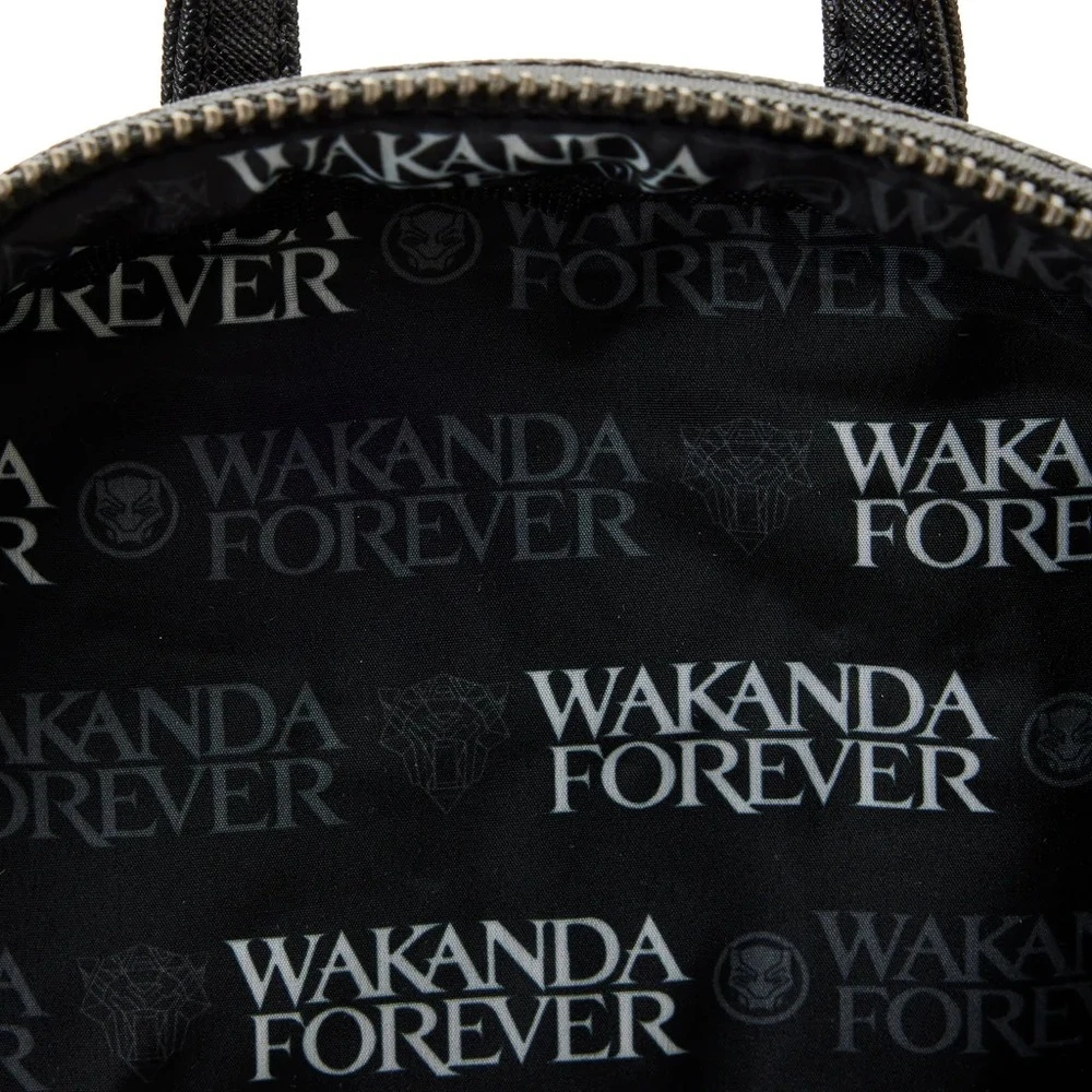 The Loungefly Black Panther: Wakanda Forever Figural Mini Backpack is made of vegan leather (polyurethane). Backpack has adjustable shoulder straps and sturdy metal hardware. Additional features include applique, debossed, and printed details. Take note of the coordinating inside lining.
