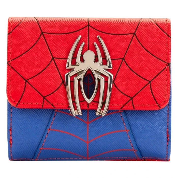 Spider-Man’s iconic red and blue suit takes the shape of a wallet in this striking Loungefly design! Webbing runs across the wallet in debossed detail, leading you to the metal applique clasp in the shape of a spider. Inside, spider webs make their home as the interior lining, and six slot compartments make for plenty of storage for your belongings.