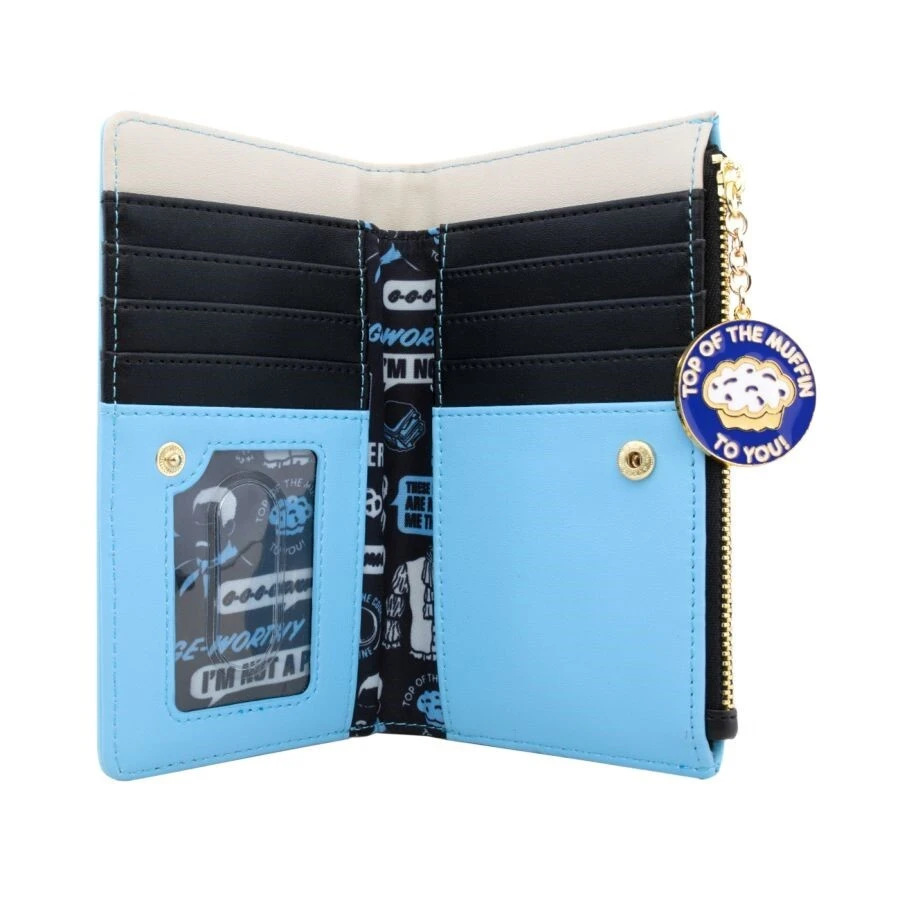 Built from faux leather, this 6″ Flap Wallet features our favourite sit-com characters in an adorable chibi style. The four characters pop from the wallet thanks to the applique detailing, atop a well detailed city background. The wallet includes a flap closure, zipper section with a custom “Top of the muffin to you!” charm, elegant metal plaque, ID holder, printed interior lining, and of course plenty of slots for your cards and cash!