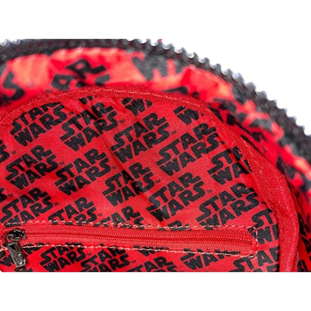 The Sith Lord rises again as this Loungefly backpack, coming to life on the front with intricate printed details and applique layers. Open the front pocket with his deadly dual-bladed lightsaber charm and Mauls piercing gaze is revealed! While he keeps a close eye on your precious items, his name appears on the back of the bag, warning all who come near which side of the Force you align with.