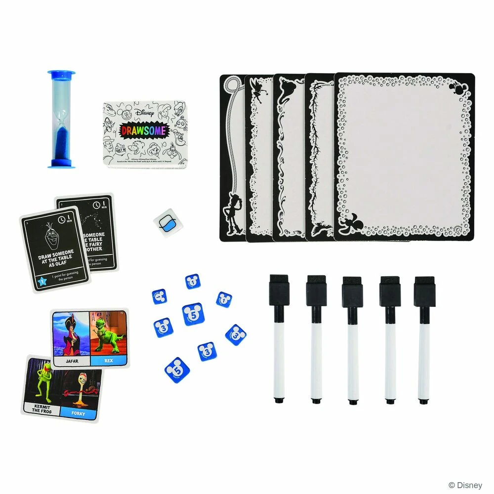 -Includes: 95 Cards, 70 Tokens, 5 Drawing Boards, 5 Pens, Sand Timer, Game Dice And Instructions.